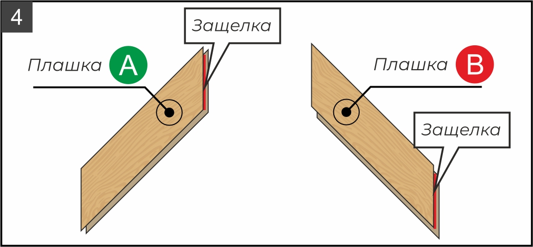 9.3. Начинайте сборку маякового ряда от левого угла комнаты, поочередно вставляя под углом плашки одного вида (плашки «А» или плашки «В») вдоль стены (рис. 6).