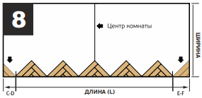 7.5.1 Разложите треугольники длинной стороной к исходной стене, выравнивая их относительно центра комнаты и боковых стен. Примечание! Для соблюдения зазоров от стен используйте распорные клинья 8 мм.