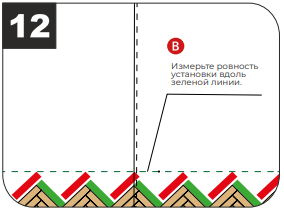 Проверьте ровность зеленой линии (см. рисунок). На протяжении всего монтажа повторяйте измерения с помощью линейки, отбивочной линии. При возникновении отклонений устраните их (см. схемы ниже).
