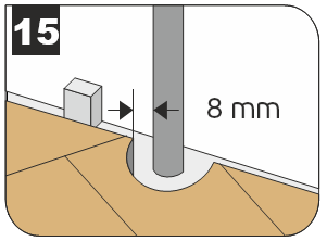 7.7.2 Демонтируйте лишние части плашек с первых треугольников. Используйте их для монтажа открытых частей пола вдоль стены. Укладывайте плашки у стены с учетом зазора для расширения 8 мм.