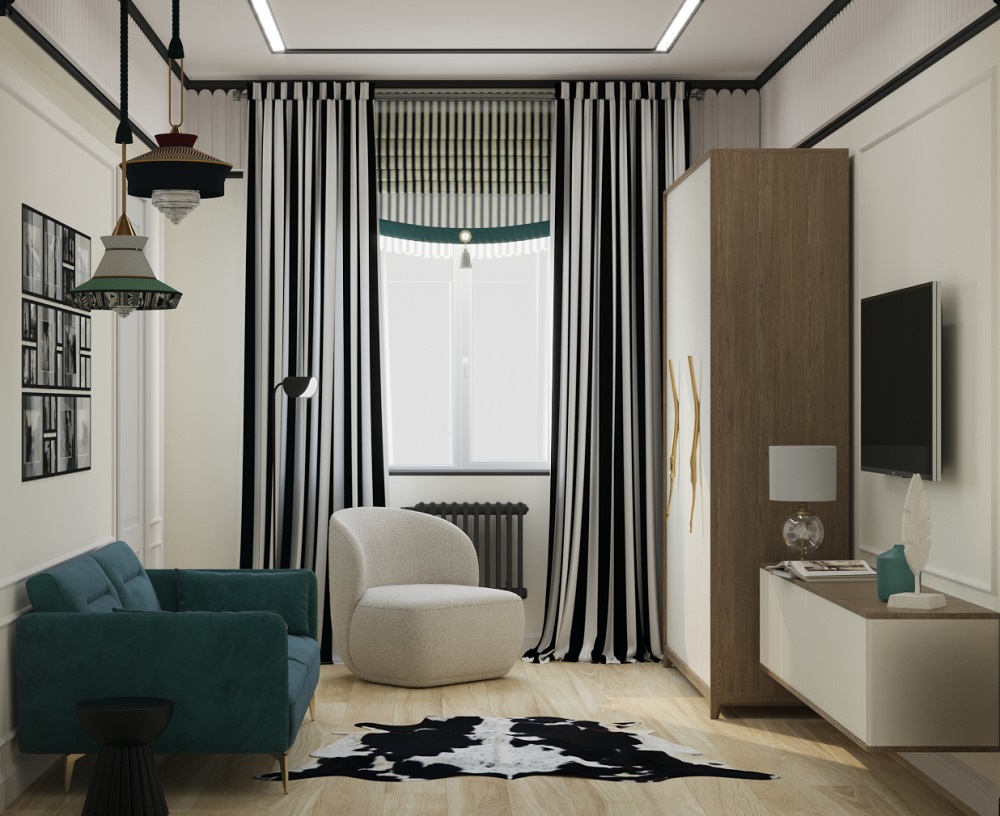 Первым делом дизайнер Ирина Райхер избавилась от многоцветной палитры в гостиной, оставив два основных – черный и белый. При этом, как и хотели герои, в гостиной остался главенствовать белый цвет. А в спальне — черный.