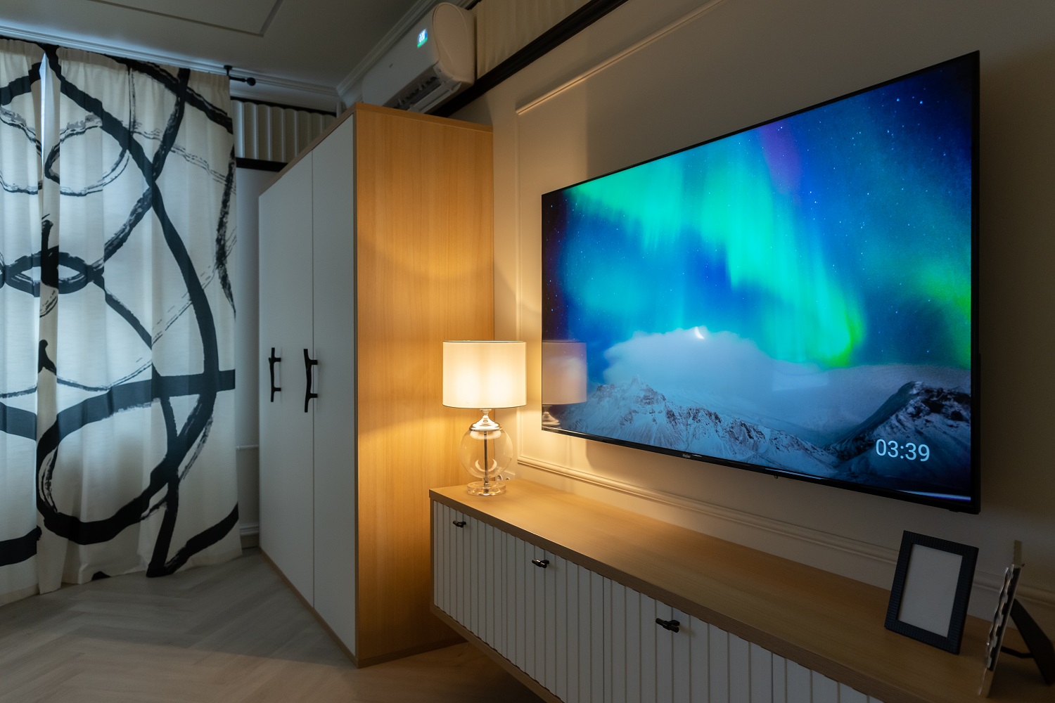 Пространство в концепции «День-ночь» создали с помощью в том числе кварцевого ламината Дуб Лондонский туман из коллекции Fargo Parquet 33-81996-14.