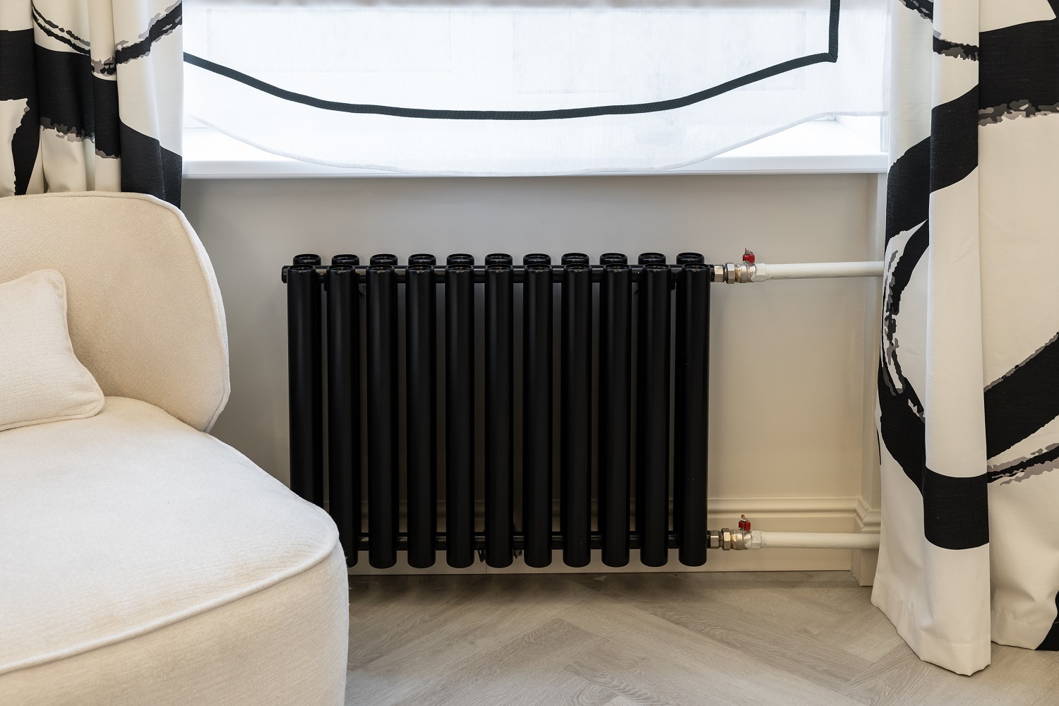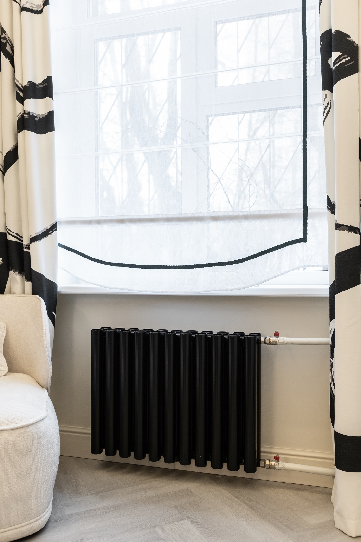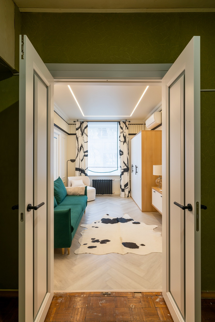 Белая гостиная с чёрной спальней