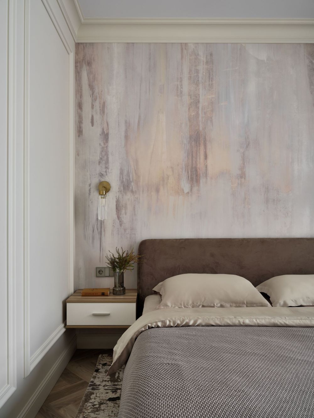 Классика этого интерьера читается в деталях — филёнках на стенах, широких карнизах и спокойной симметрии. Пространство звучит современно и легко, как продуманная композиция без лишних нот. Акцентная стена в цвете хаки добавляет интерьеру глубину и гармонично объединяется с тёплым деревом в отделке.
